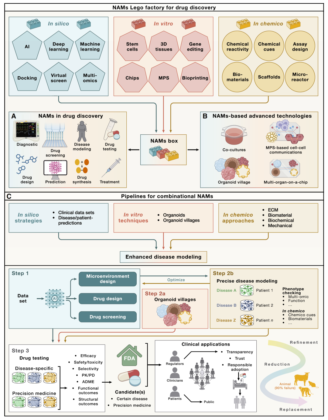 本综述系统展示了NAMs在药物研发中的重要作用,并强调其正在推动整个领域发生范式转变。从细胞层面到器官层面,再到计算模型,NAMs构建了一个多层次的人类中心研究体系。