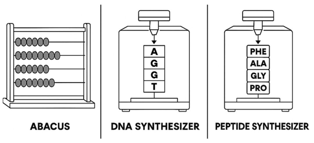 图1:算盘、DNA合成仪与肽合成仪类比。