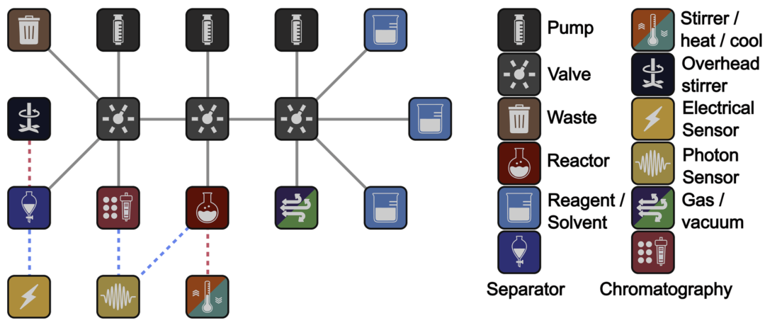 Chemputer 的硬件被表示为一个图结构,其中节点代表反应器、分离器等模块,边代表物质和能量的流动。