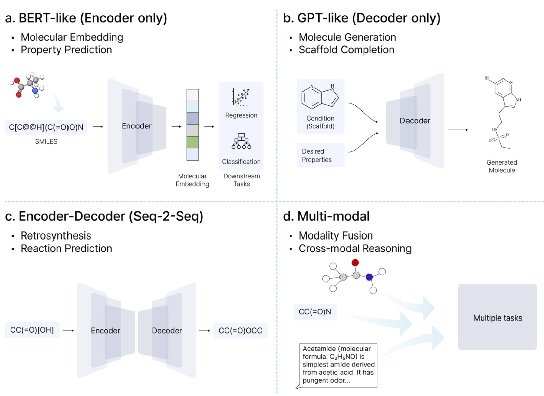 化学语言模型主要分为编码器、解码器以及编码器–解码器结构。