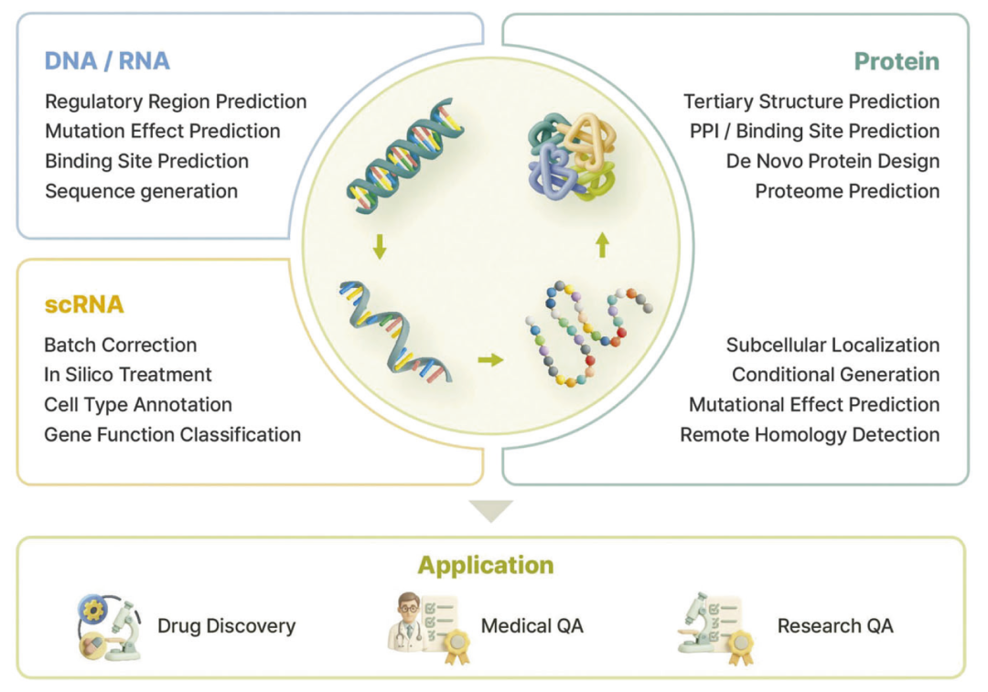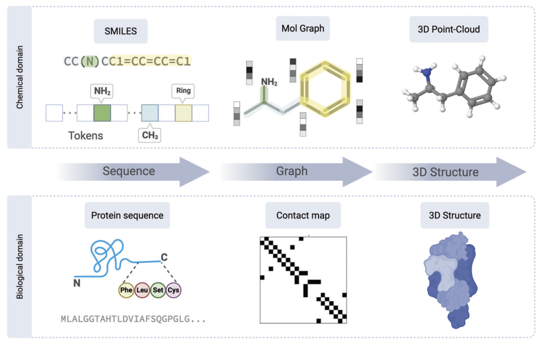 本文综述了生物大分子与小分子化合物的关键表示方式,包括蛋白质和核酸序列、单细胞数据、基于字符串的化学表示、图结构编码以及三维点云表示,并分析了它们在人工智能中的优势与局限。同时,研究人员还讨论了核心模型架构,如类似BERT的编码器、类似GPT的解码器以及编码器–解码器结构,并介绍了自监督学习、多任务学习和检索增强生成等预训练策略。