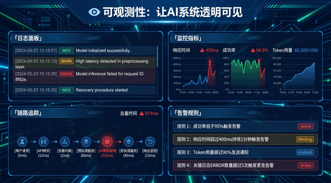 AI 系统是个"黑盒"——你不知道它为什么给出这个回答,也不知道哪个环节慢了。可观测性就是给这个黑盒装上"眼睛",让你随时知道系统在做什么。