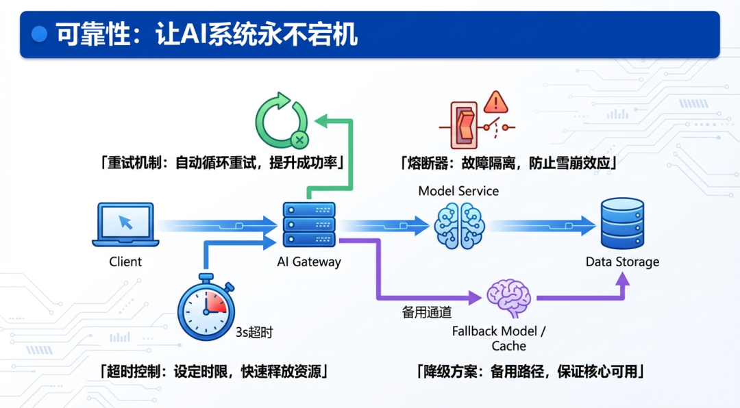 AI API 不是 100% 可靠的——网络抖动、模型过载、配额耗尽都会导致调用失败。可靠性工程的核心是优雅地处理失败,而不是假装失败不会发生。