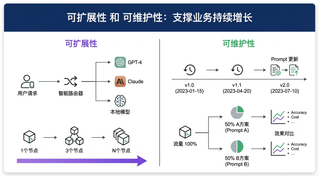 AI 系统的核心资产是 Prompt,必须像代码一样进行版本管理,支持快速回滚和 A/B 测试。