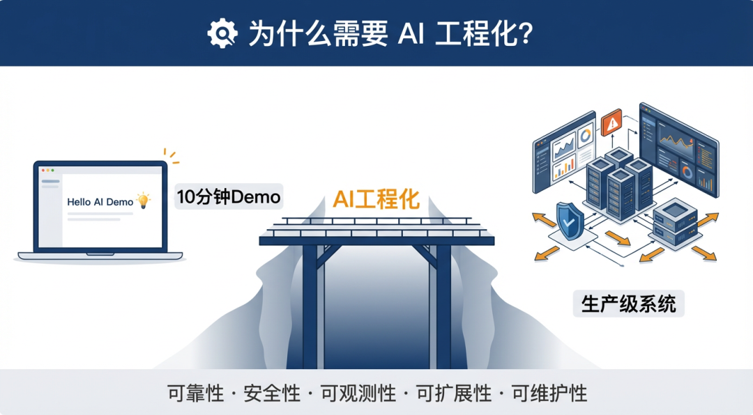 💡 真实场景:某电商平台上线 AI 客服 Demo,效果很好。但一到大促流量高峰,AI API 偶尔超时,系统没有降级处理,导致整个客服页面白屏。工程化的目标就是让这类问题不再发生。 |