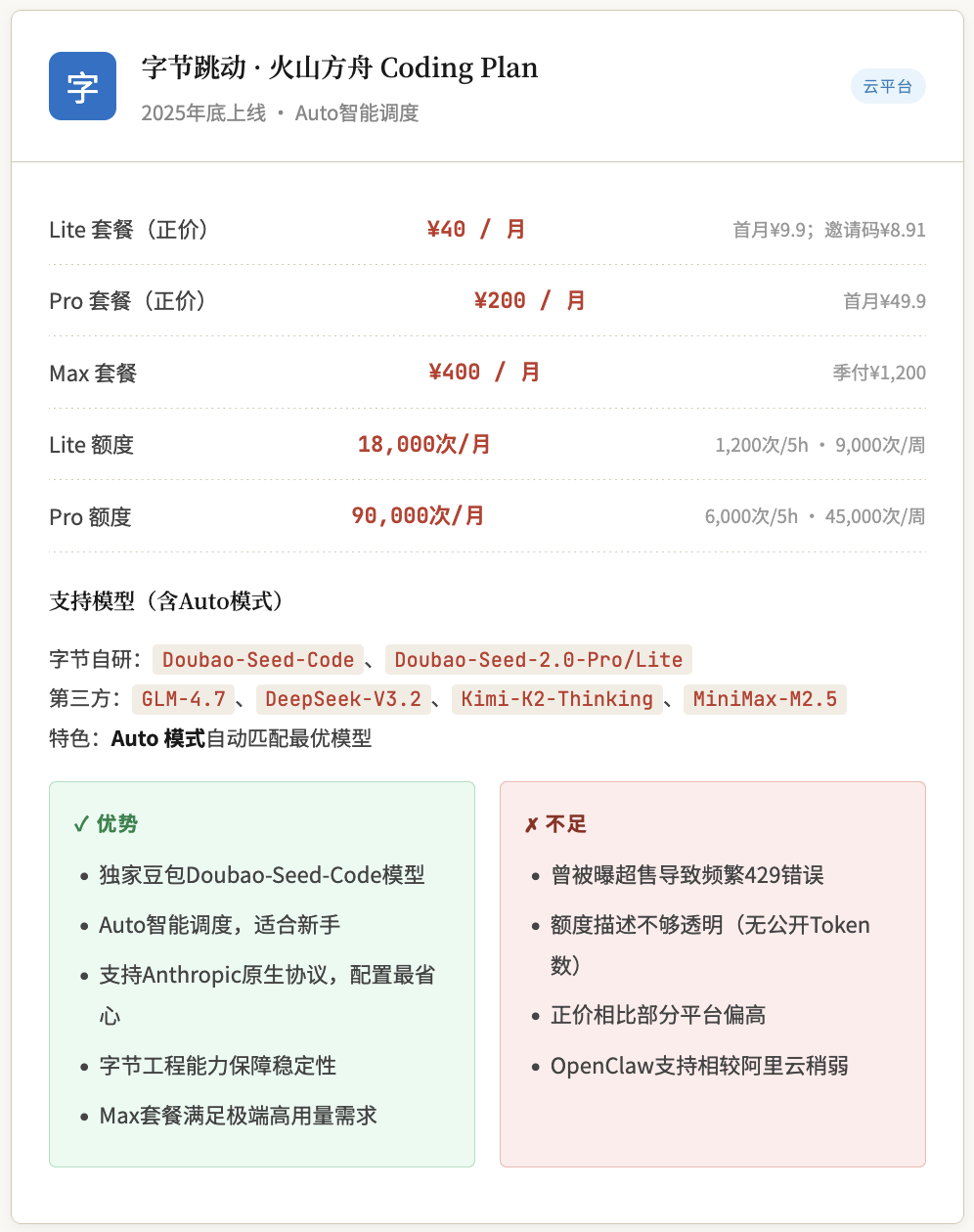 火山方舟 | 云平台 | ¥40 | ¥200 | ¥9.9 | 7款+Auto | ✓ 支持 |