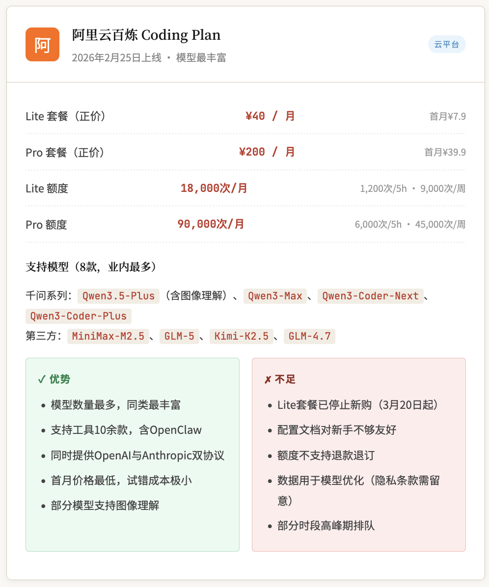 刚入门 / 试水 | 阿里云百炼 Lite ¥7.9 (已停止) | 腾讯云 Lite ¥7.9(很难抢到) | 价格最低,模型最多,一单试齐 |