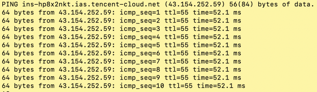 例如,这是检测 OpenClaw 主机到腾讯云服务端点的网络情况,留意 icmp_seq 有没有丢包,以及延时 time 是否比较小: