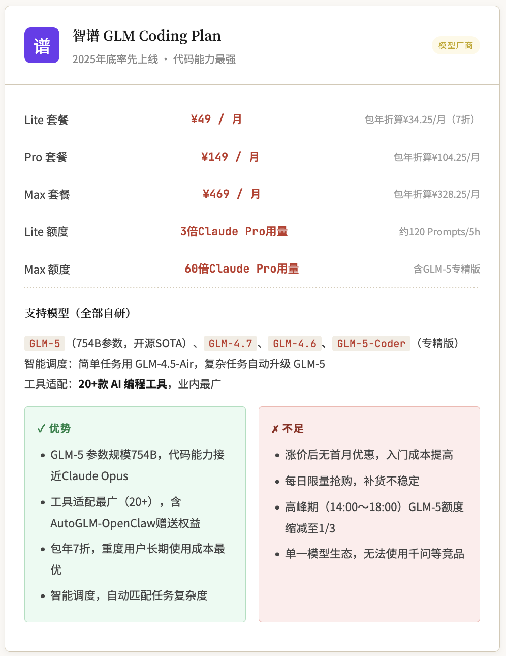 智谱 GLM | 模型厂商 | ¥49 | ¥149 | 无 | GLM全系列 | ✓ 20+工具 |