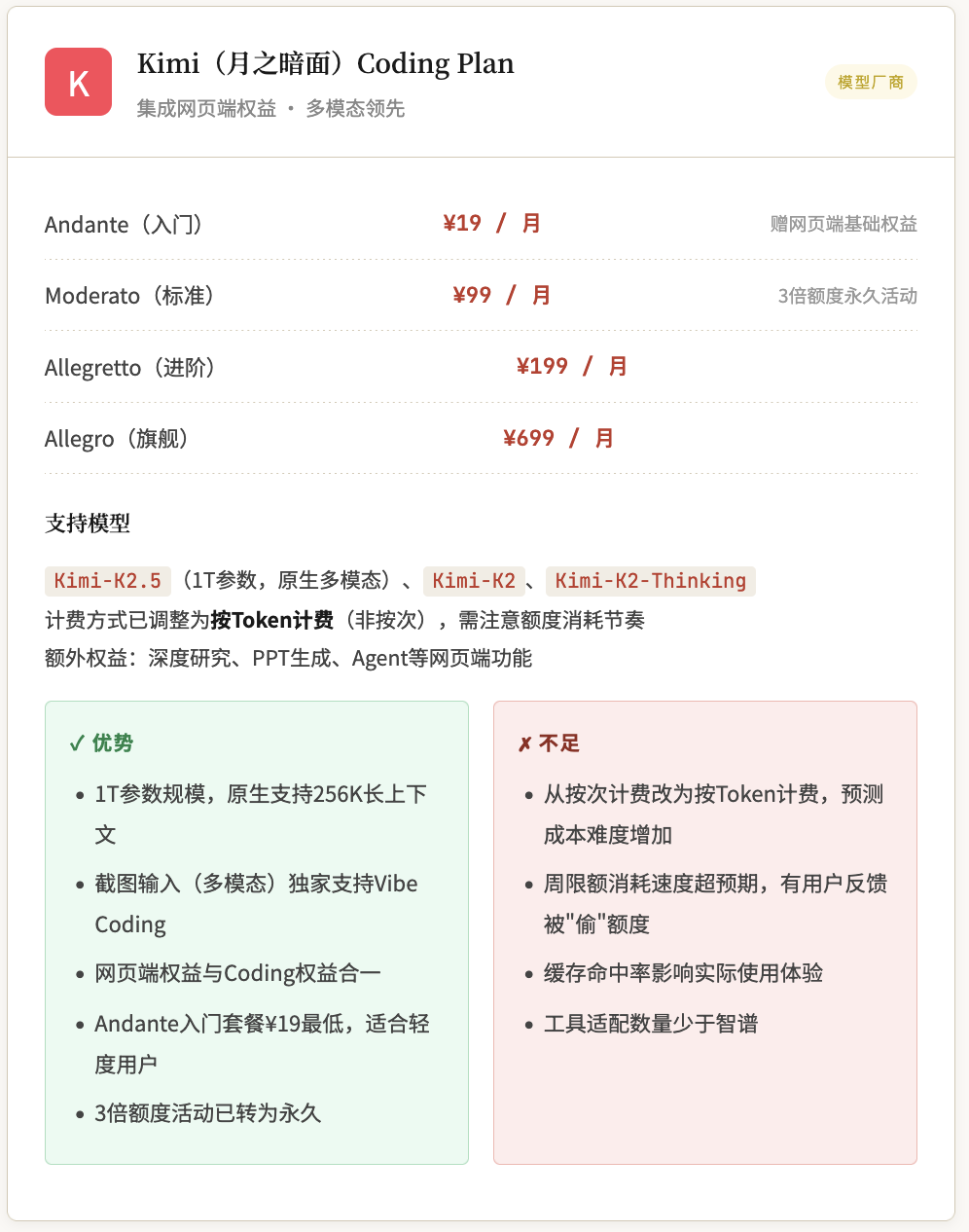 Kimi(月之暗面) | 模型厂商 | ¥19 | ¥99 | ¥19起 | K2全系列 | ✓ 支持 |