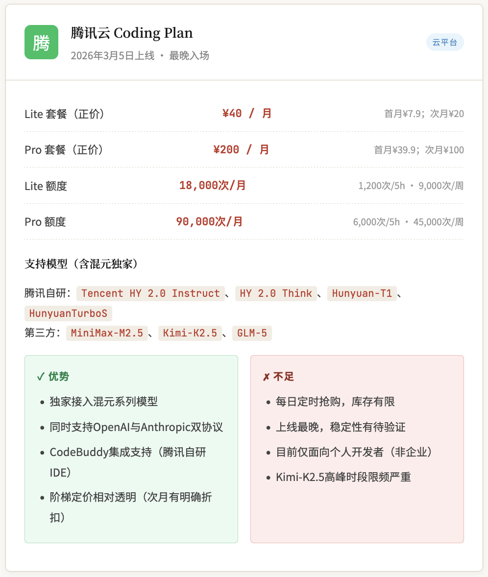 腾讯生态用户 | 腾讯云 Pro ¥200 | — | 混元独家,双协议,CodeBuddy集成 |