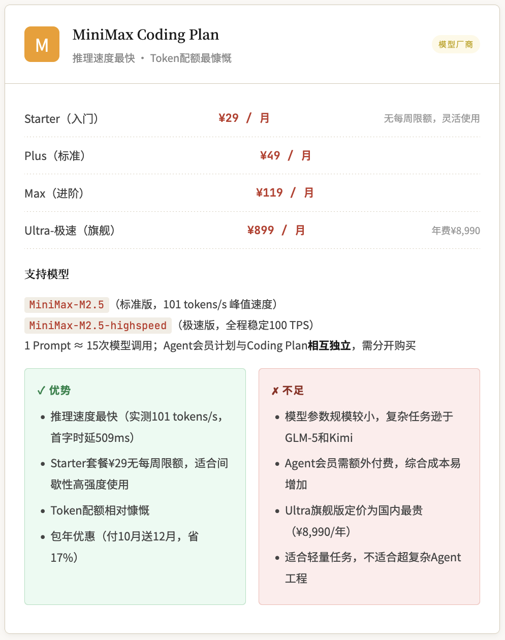 MiniMax | 模型厂商 | ¥29 | ¥49 | ¥29起 | M2.5全系列 | ✓ 支持 |