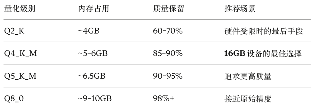 类比来理解:如果原始模型是一幅 8K 分辨率的油画,量化就是把它缩小成不同尺寸的印刷品。Q8_0 相当于 4K 打印,肉眼几乎看不出区别;Q4_K_M 相当于 1080P,细节略有损失但整体观感良好;Q2_K 相当于 480P,凑合能看,但已经开始模糊。