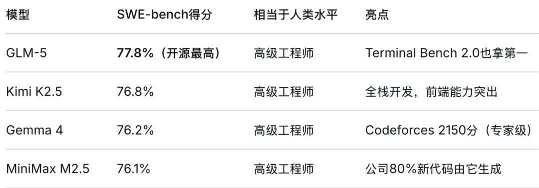 综合来看,GLM-5 在标准化测试中登顶开源模型,综合实力最强。Kimi K2.5以前端开发和全库理解见长,适合界面生成与项目重构。MiniMax M2.5用“80%代码自产”证明了实战价值,多语言能力突出。Gemma 4 进步最猛,算法题稳健,是个人开发者的优质选择。选代码模型,看你要标杆、要实战、还是要性价比。