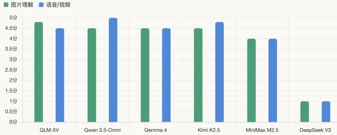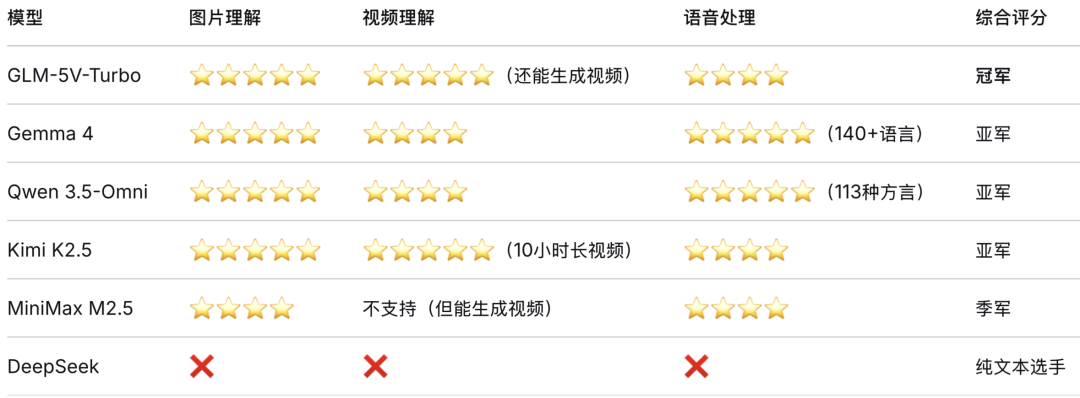 多模态赛道上,GLM-5V-Turbo 凭借“理解+生成”的双向能力拔得头筹,是真正的全能选手。Gemma 4 和 Qwen 3.5-Omni 在各自擅长领域表现顶尖,前者语言覆盖广,后者方言识别强。Kimi K2.5 的长视频理解独树一帜。而DeepSeek 虽在多模态缺席,却是纯文本推理的最佳选择——选谁,取决于你是否需要让AI“看懂”世界。