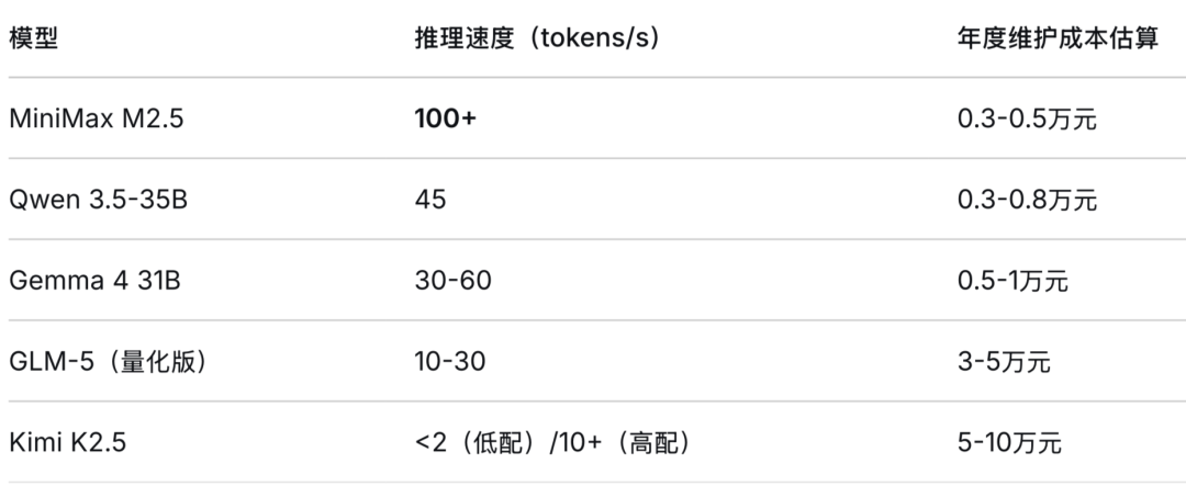 • MiniMax M2.5 和 Qwen 3.5-9B 就像刚毕业的985高材生——能力强、工资低(1-2万硬件搞定)、干活快(100 tokens/秒)。MiniMax通过INT4量化,显存从24GB降至8GB,一张RTX 3060就能跑。API成本更是惊人:输入约0.3美元/百万Token,输出约2.4美元,比顶级闭源模型便宜约100倍。