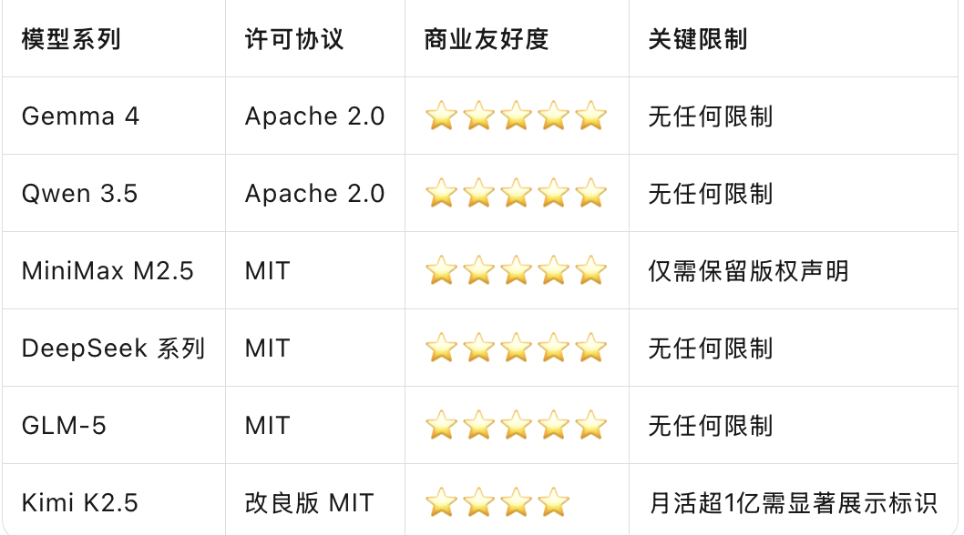 一句话总结: Gemma 4 和国内三巨头(通义、MiniMax、DeepSeek)都给出了“无附加条件”的宽松合同,想怎么用就怎么用,完全不用担心法律风险。