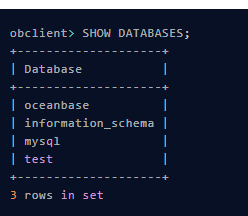 执行结果中,会新增我们创建的test和ob_business两个数据库,说明创建成功。