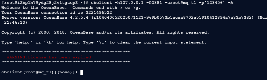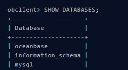 登录成功后,终端会显示 obclient [(none)]> ,表示已进入租户,且未切换到任何数据库,此时即可开始创建数据库。
