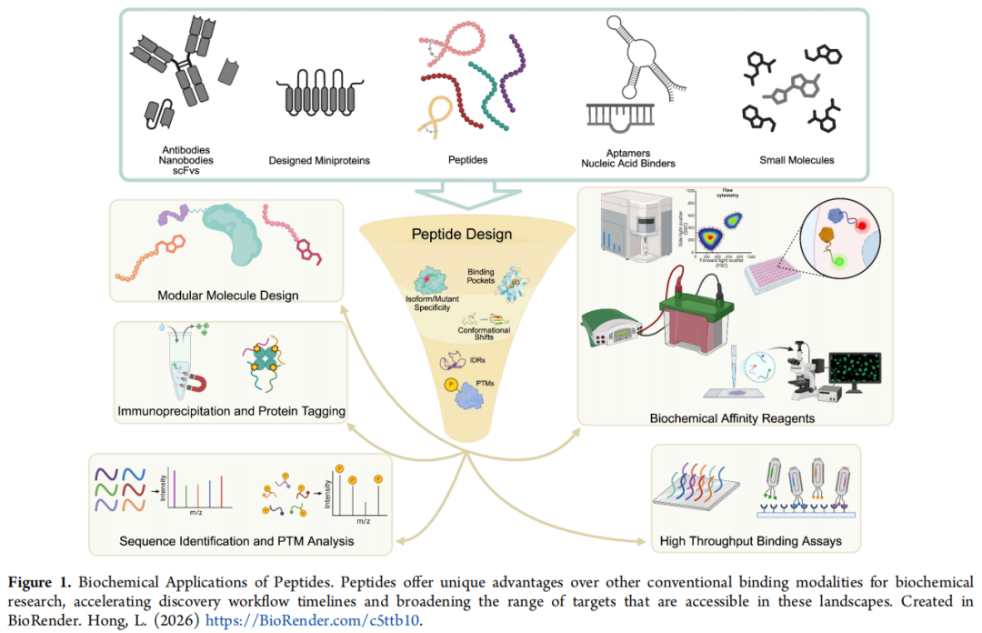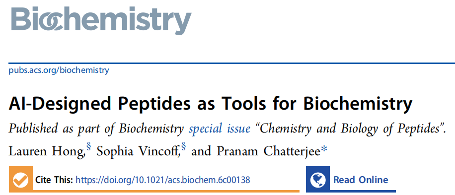 文献来源: Hong L, Vincoff S, Chatterjee P. AI-Designed Peptides as Tools for Biochemistry. Biochemistry, 2026. DOI: 10.1021/acs.biochem.6c00138 作者单位: 宾夕法尼亚大学生物工程系 & 计算机与信息科学系(通讯作者:Pranam Chatterjee) 发表期刊: Biochemistry(ACS)