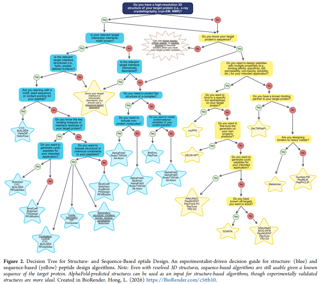 └─ 不知道序列 → 先通过噬菌体展示等发现结合伴侣关键注意事项: 即使有已解析三维结构,序列方法通常仍可使用,且在处理无序靶标时往往表现更优;AlphaFold 预测结构可作为结构方法输入,但实验验证结构更为理想。