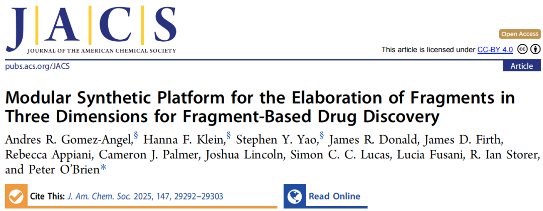 文献来源:Gomez-Angel, A. R.; Klein, H. F.; Yao, S. Y. et al. J. Am. Chem. Soc.2025, 147, 29292–29303. DOI:10.1021/jacs.5c08786 通讯作者:Peter O'Brien,英国约克大学化学系 合作机构:AstraZeneca Hit Discovery, Discovery Sciences