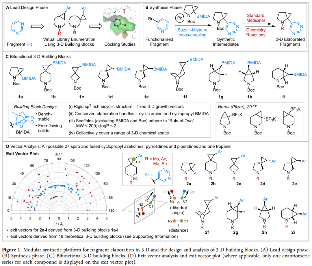 信息层面 | 系统性出射向量分析(27 种虚拟构建块,112 个虚拟先导化合物),提供三维化学空间地图 |
