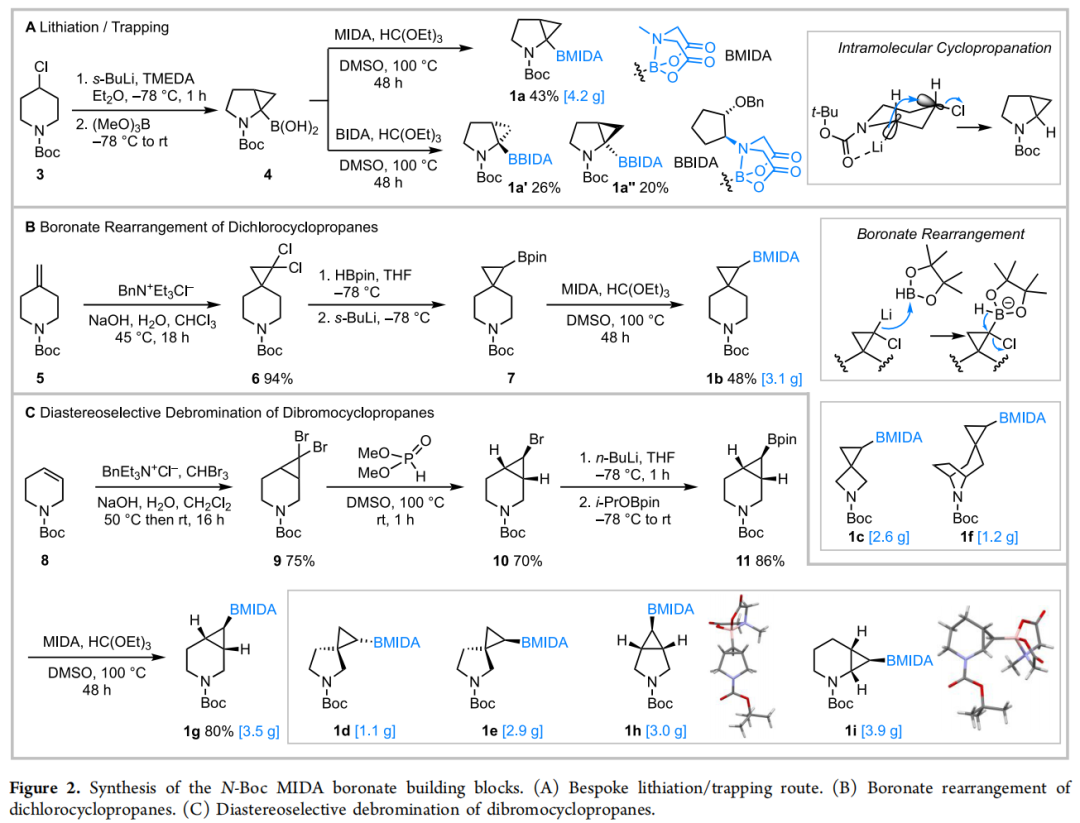 ↓ MIDA → 构建块 1g(80%,3.5 g/批)注意事项:对于螺环吡咯烷系列(1d vs. 1e),由于环丙烷两侧位阻相近,单去溴反应缺乏非对映选择性(55:45),需通过分离非对映体分别获得 1d 和 1e,构型通过中间体 X 射线晶体学归属。