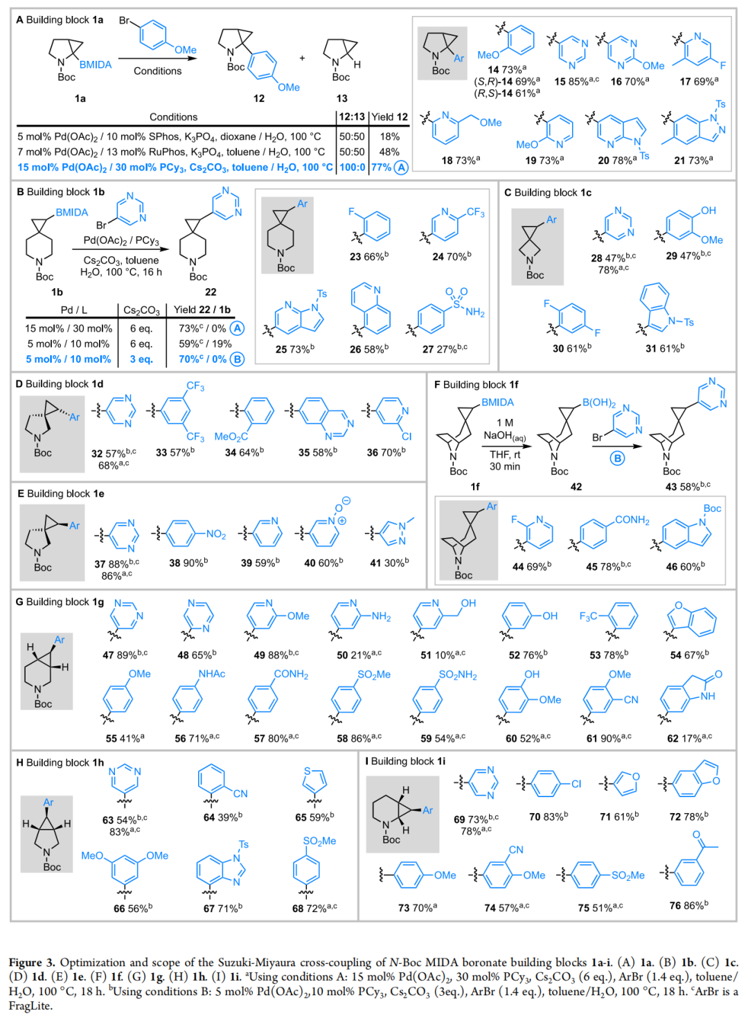 特殊情况——热带构建块 1f:由于 1f 在甲苯/水体系中溶解性差,先用 NaOH(aq) 原位水解 MIDA 硼酸酯生成假定的硼酸(42),再进行偶联,以 58–78% 收率获得目标产物(44–46)。