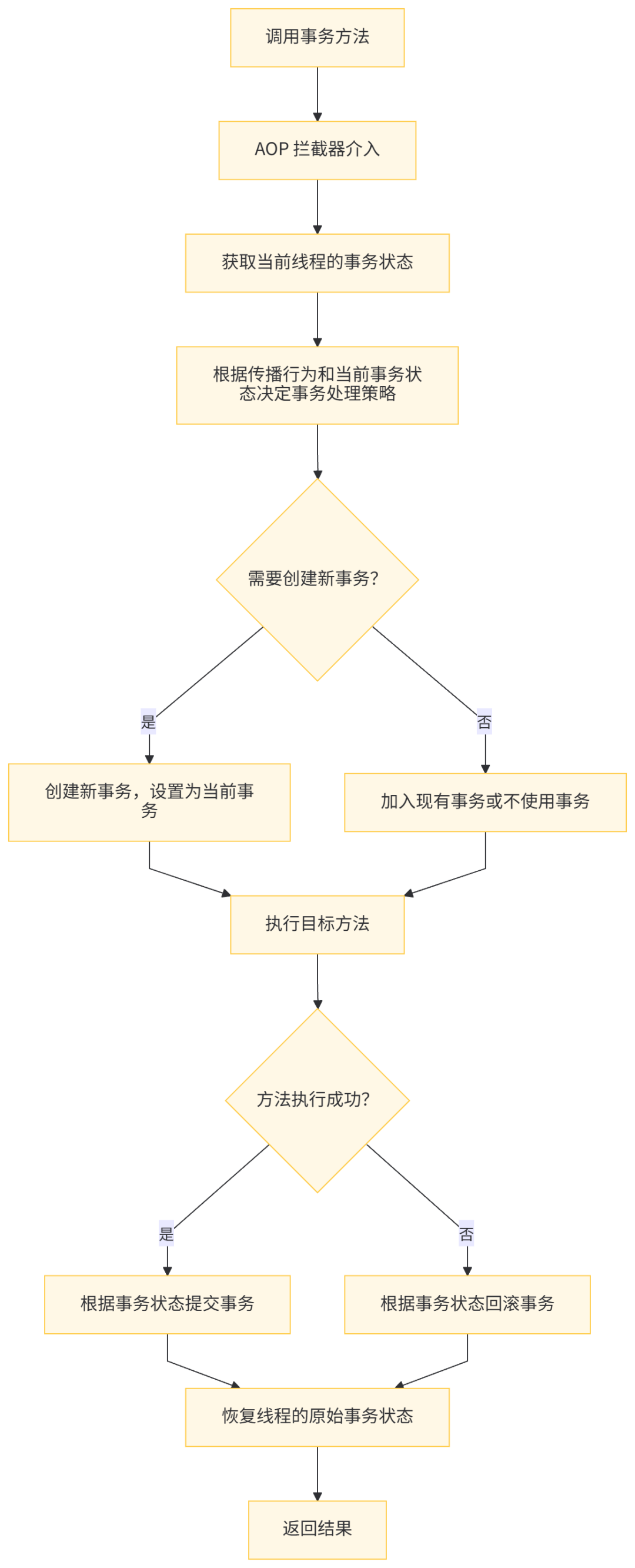 当一个标注了@Transactional的方法被调用时,Spring 会通过 AOP 拦截该方法,执行以下步骤: