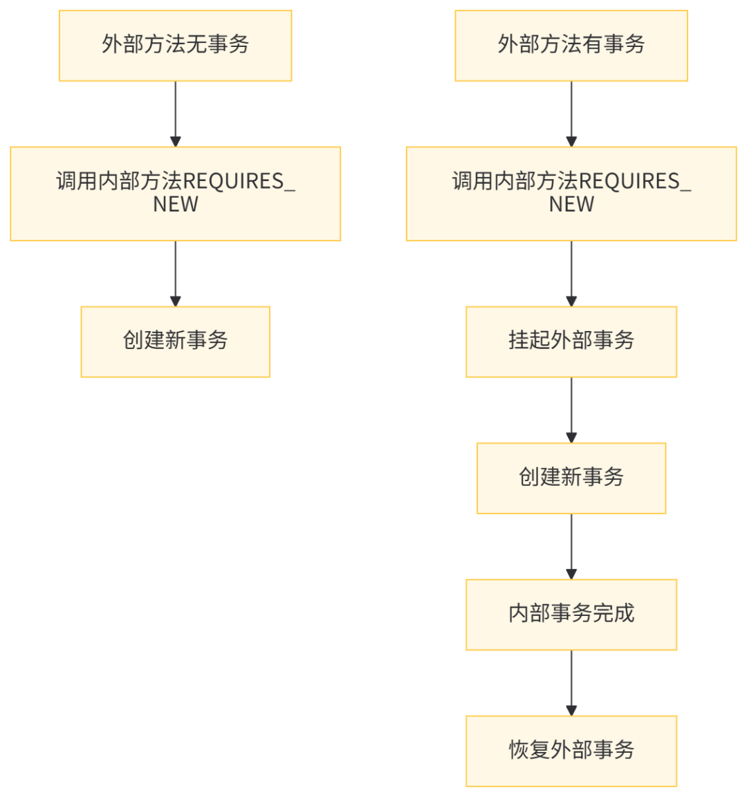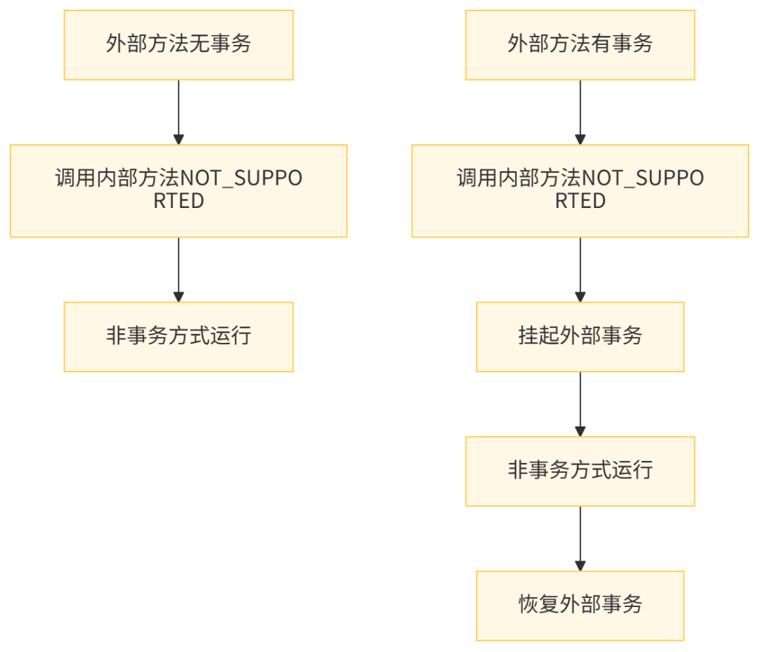 createOrderWithoutTx():reduceStock()会创建新事务createOrderWithTx():reduceStock()加入外部事务行为定义:如果当前存在事务,则加入该事务;如果当前没有事务,则以非事务方式运行。