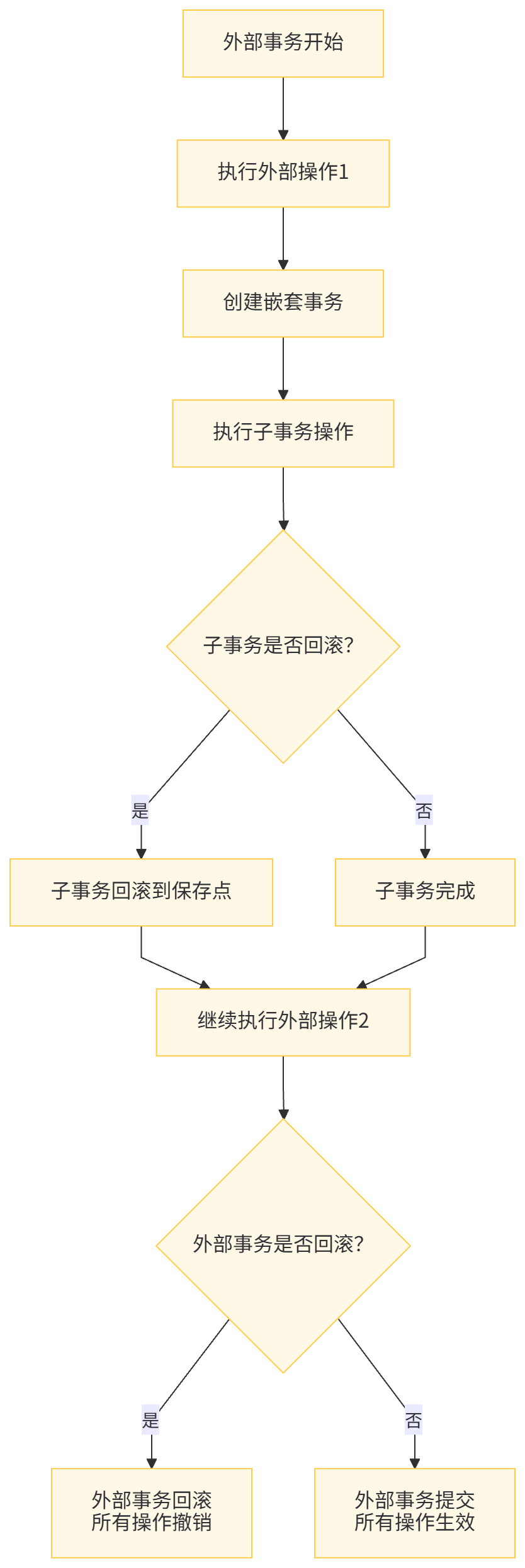 OrderProcessService.createCompleteOrder():REQUIRED - 主事务OrderService.createOrder():REQUIRED - 参与主事务InventoryService.reduceStock():REQUIRED - 参与主事务AccountService.reduceBalance():REQUIRED - 参与主事务PointsService.addPoints():NESTED - 嵌套事务,失败可回滚但不影响主流程LogService.recordLog():REQUIRES_NEW - 独立事务,确保日志被记录这种配置的优势: