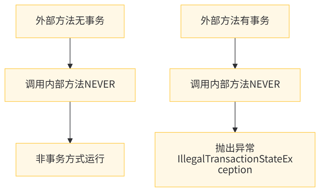 NEVER(TransactionDefinition.PROPAGATION_NEVER),