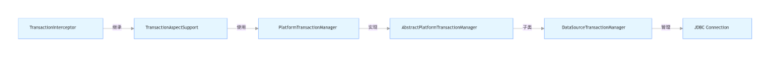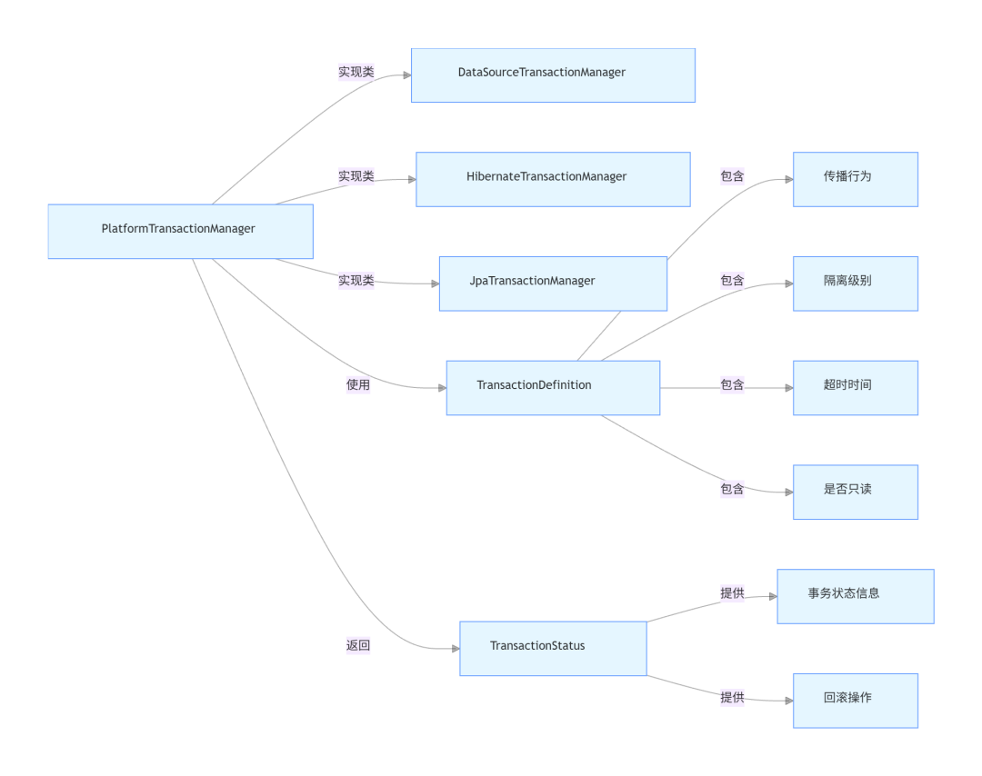 Spring 事务管理涉及多个核心组件,它们协同工作完成事务的创建、提交和回滚: