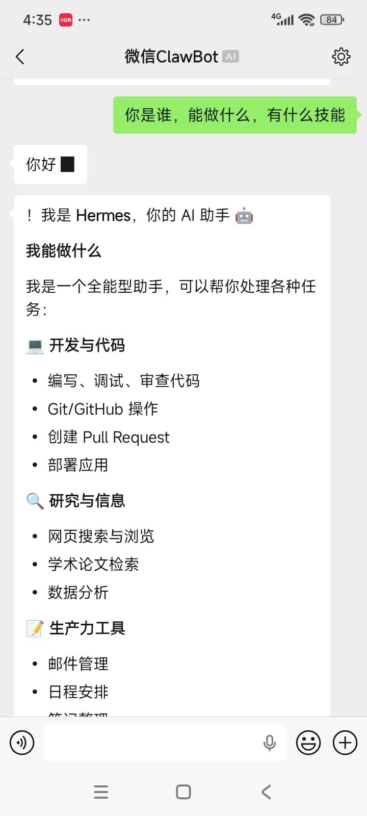 点击“继续连接”后,可以看到手机微信界面跳到了之前连 QClaw 的对话框。