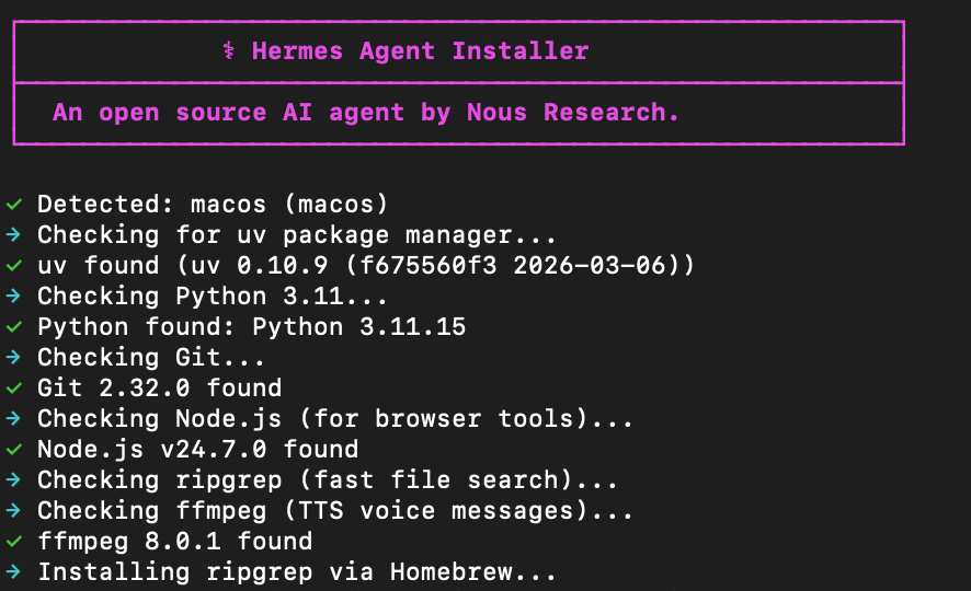 curl -fsSL https://raw.githubusercontent.com/NousResearch/hermes-agent/main/scripts/install.sh | bash