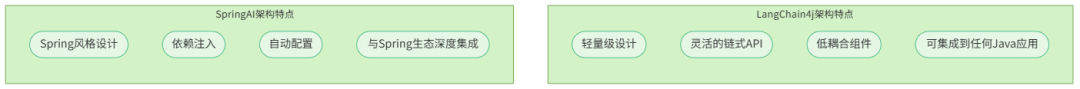 -** SpringAI** 则紧密集成 Spring 生态,提供了更符合 Spring 开发者习惯的 API 和自动配置能力,适合 Spring Boot/Cloud 微服务架构。其统一的客户端抽象和与 Spring 生态的深度融合是主要优势。