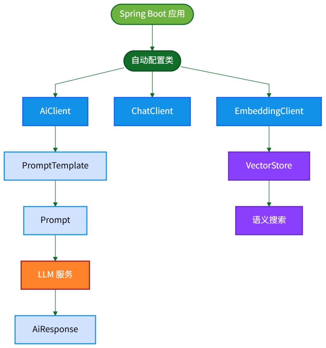 SpringAI:Spring 生态官方推出的 AI 集成框架,定位为 "Apply AI principles to Spring applications",致力于将 AI 能力无缝融入 Spring 生态,提供与 Spring Boot、Spring Cloud 等组件的自然集成(来源:SpringAI 官方 GitHub 仓库)。