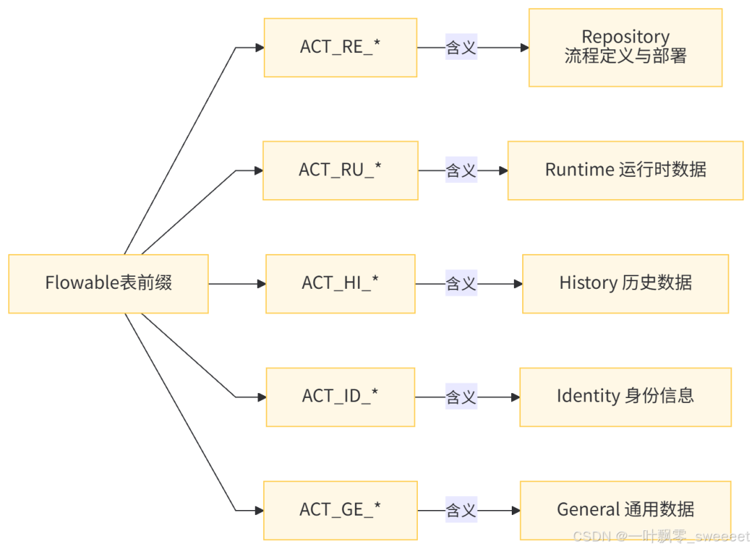 Flowable 需要一系列数据库表来存储流程定义、实例、任务等数据。这些表名均以 "ACT_" 开头,按功能分为几大类: