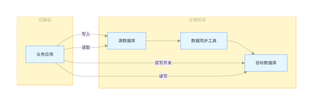 双写阶段是零停机迁移的核心,在此阶段应用会同时向源数据库和目标数据库写入数据,并通过同步工具保证两边数据一致。