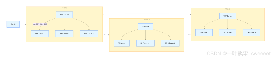 TiDB 采用了经典的 "计算 - 存储分离" 架构,将整个系统分为三个主要组件: