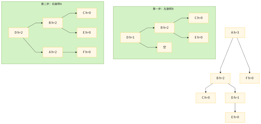 节点的左子树的右子树插入新节点,导致该节点平衡因子=2(比如节点A的BF=2,左孩子B的BF=-1)。