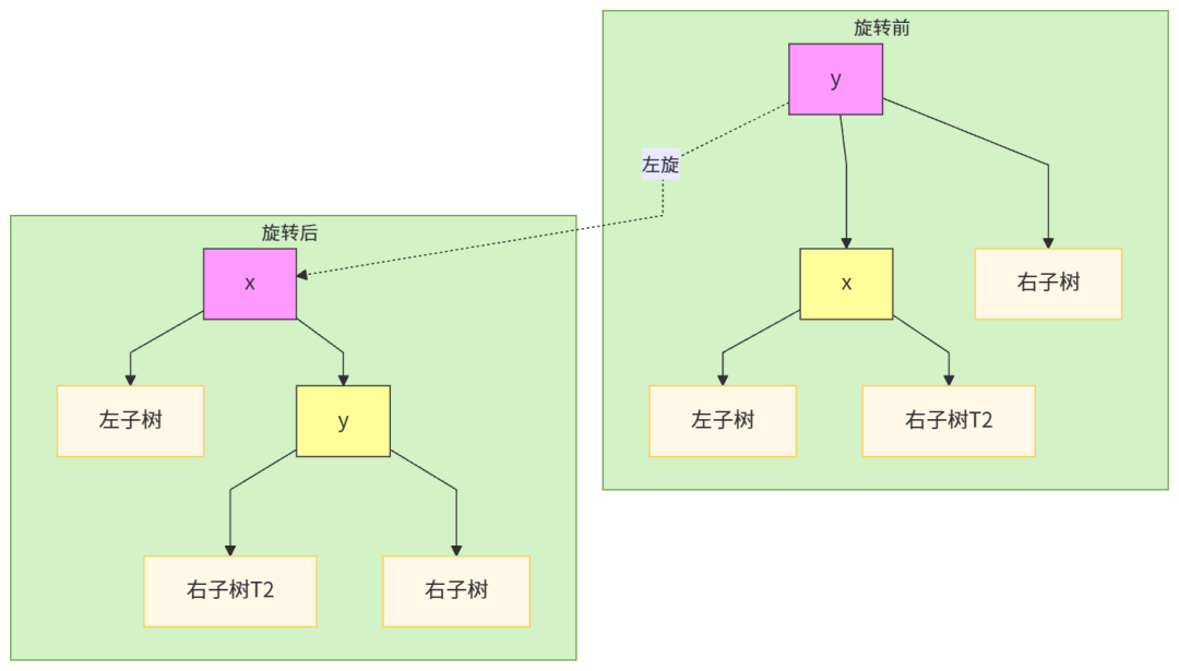以节点x为支点,将其右子树y提升为父节点,x成为y的左子节点,y的左子树转为x的右子树。