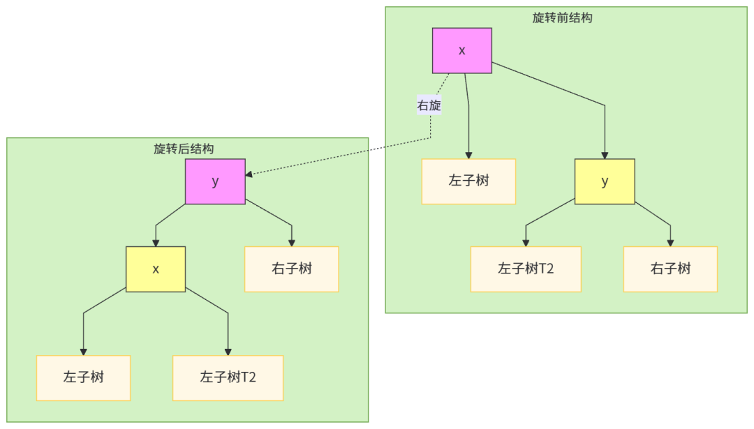 以节点y为支点,将其左子树x提升为父节点,y成为x的右子节点,x的右子树转为y的左子树(与左旋对称)。
