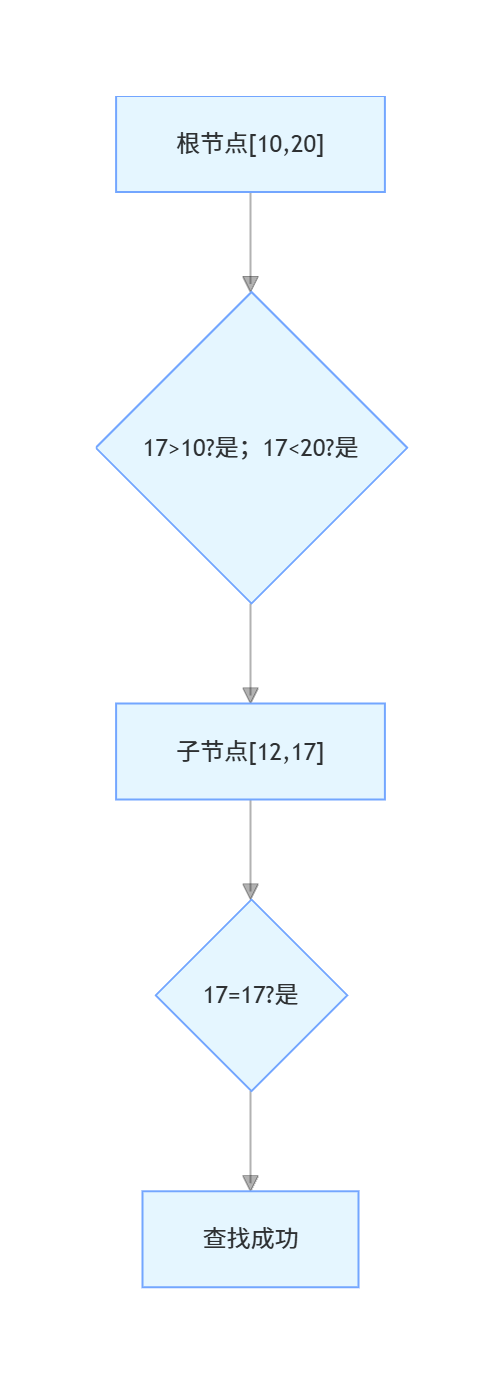 实例:3阶B树结构(根节点:[10,20],孩子:[5,6]、[12,17]、[30]),查找关键字17: