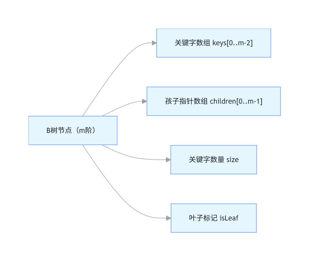 例如3阶B树的非叶子节点,keys数组长度为2,children数组长度为3;叶子节点的children数组为空(或null)。