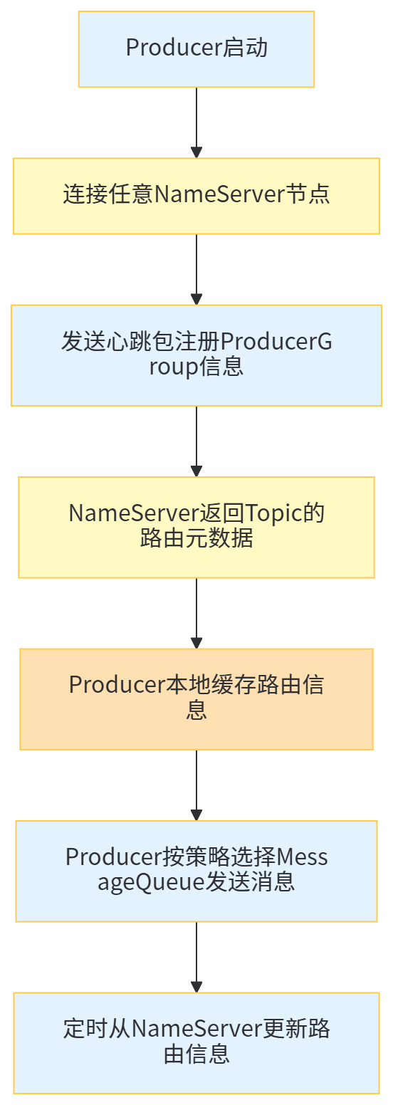 Producer发送消息前需获取Topic的路由信息(即该Topic分布在哪些Broker的哪些MessageQueue),流程如下: