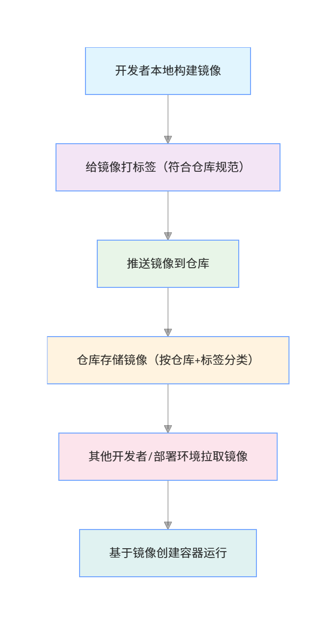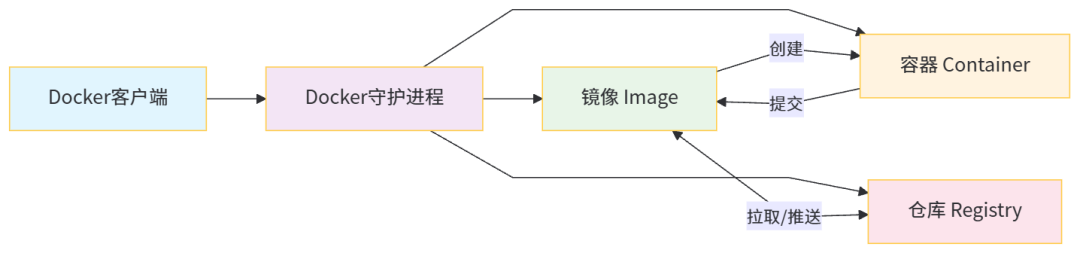 三者的核心流转逻辑:从仓库拉取镜像 → 基于镜像创建容器 → 容器运行应用 → 可将容器修改提交为新镜像 → 推送新镜像到仓库共享。
