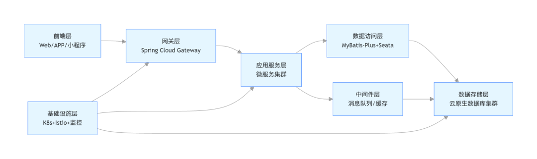 基于TOGAF分层架构思想,结合云原生数据库的特性,企业信息系统架构可分为“前端层、网关层、应用服务层、数据访问层、数据存储层、基础设施层”六大核心层级。各层级职责清晰,通过标准化接口交互,确保架构的可扩展性与可维护性。