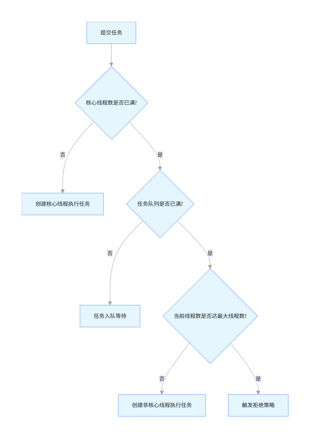 corePoolSize,直接创建核心线程执行任务;workQueue队列等待;maximumPoolSize,创建非核心线程执行任务;handler拒绝策略(如丢弃任务、抛出异常)。流程图如下: